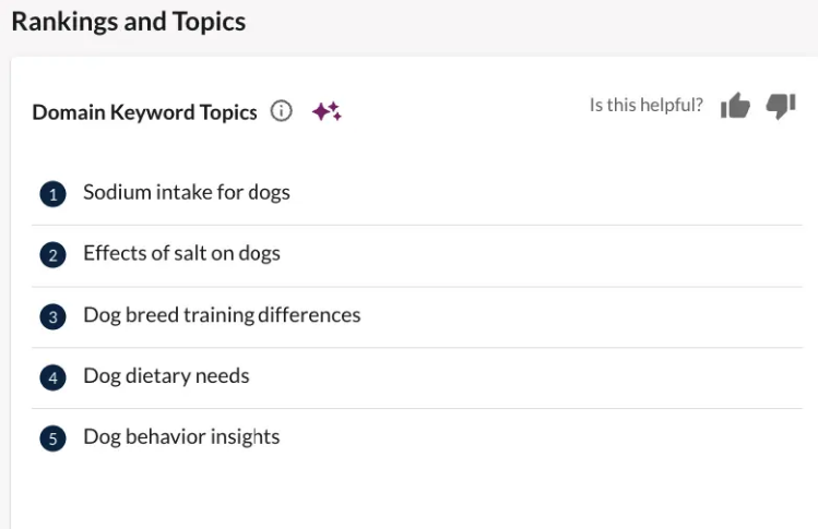使用 Reddit、 Google Discover和竞争对手的内容来展示热门主题。抓取竞争对手内容和关键词的最简单方法是使用 Moz Pro 中的“域名概览”功能来识别网站的主题。例如,这些是 Tails.com的热门主题,它是我们示例网站Pooch & Mutt的竞争对手 。