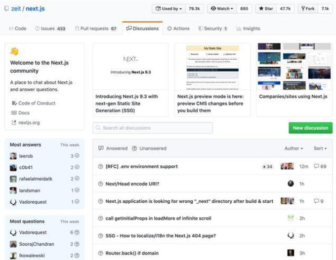 GitHub Discussions 存在开发者的项目资源库中,使用线程格式来启动,开发者可以很快地响应和组织非结构化对话。并可将问题标记为已回答,如此一来,将丰富社区的知识库,还可用来维护常见问题解答和协作其他文档。