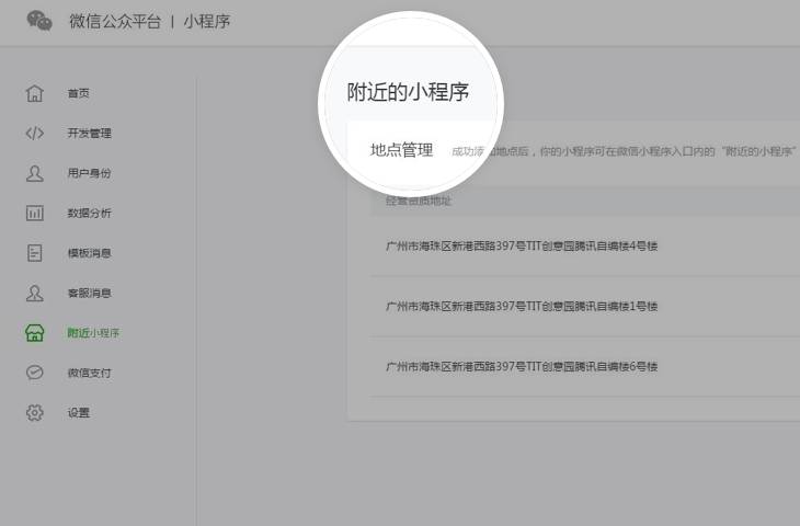 小程序后台新增附近的小程序功能,申请开通后支持添加地点。添加地点后即可展示在附近的小程序。