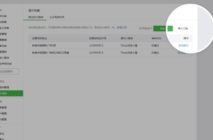 已有门店小程序的公众号,以导入门店方式添加地点后,该门店小程序即可展示在附近的小程序。